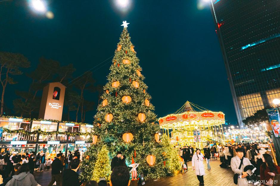중앙의 대형 트리는 메인 포토존으로, 바닥에 표시된 위치에 서서 찍으면 누구나 예쁜 사진을 남길 수 있어요. 바로 옆에는 무료로 이용 가능한 2층 회전목마도 있어 연말 데이트 코스로 특히 인기가 많습니다.