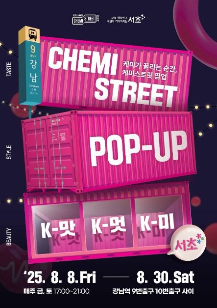이번 케미스트릿 팝업은 여름의 중심, 2025년 8월 8일부터 8월 30일까지 약 3주간 열립니다. 서울 서초구청과 서초여성일자리주식회사가 함께 준비한 이 축제는 강남역을 오가는 누구나 자연스럽게 들러 즐길 수 있도록 기획되었습니다.